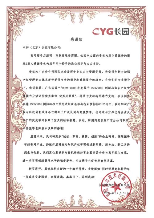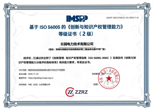 长园电力获得由taptap点点体育(北京)认证有限公司颁发的ISO 56005创新与知识产权管理能力证书,标志着公司在创新管理体系与知识产权战略融合方面,已达到系统化、规范化的国际先进水平。